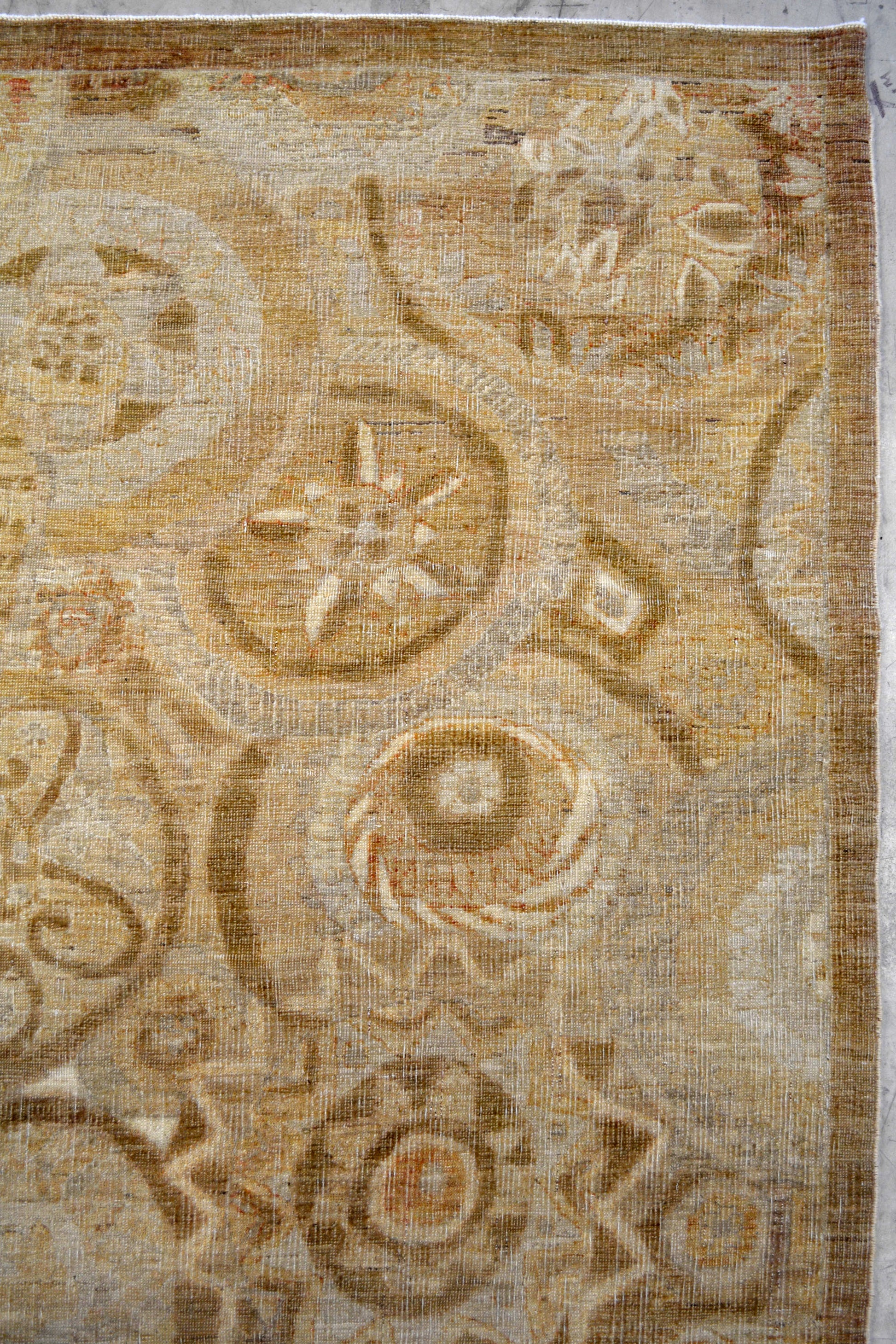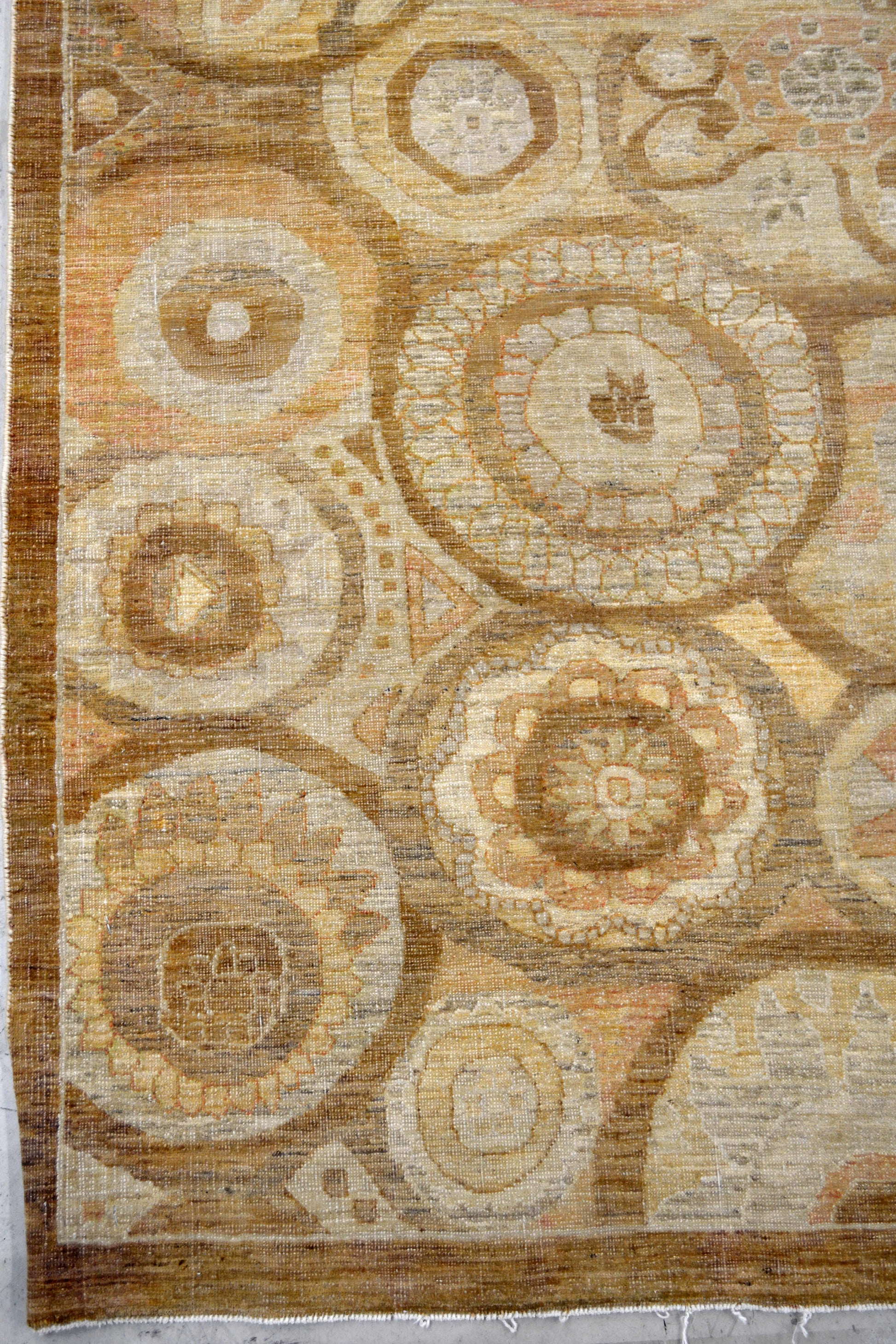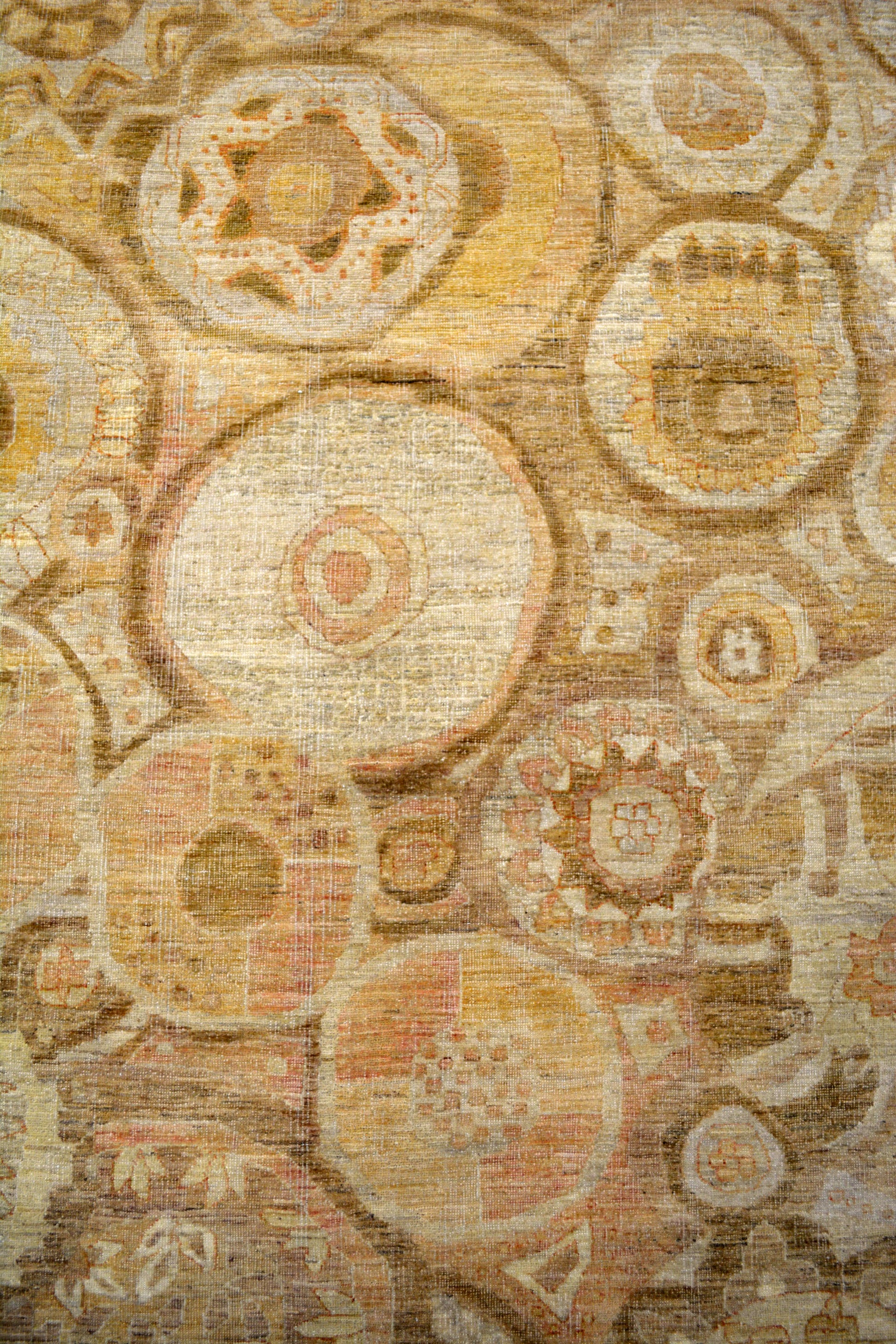 This amazing rug was woven within the classic style, and the color scheme oscillates among beige, yellow, and brown. The pleasant color palette would attract calmness to your environment for your place. On the bottom left corner, there is a thin solid brown border which encloses the whole pattern. On the top right corner, the pattern shows a lot circled compositions which contain mandalas and stars. The center's close-up renders circles and rings.