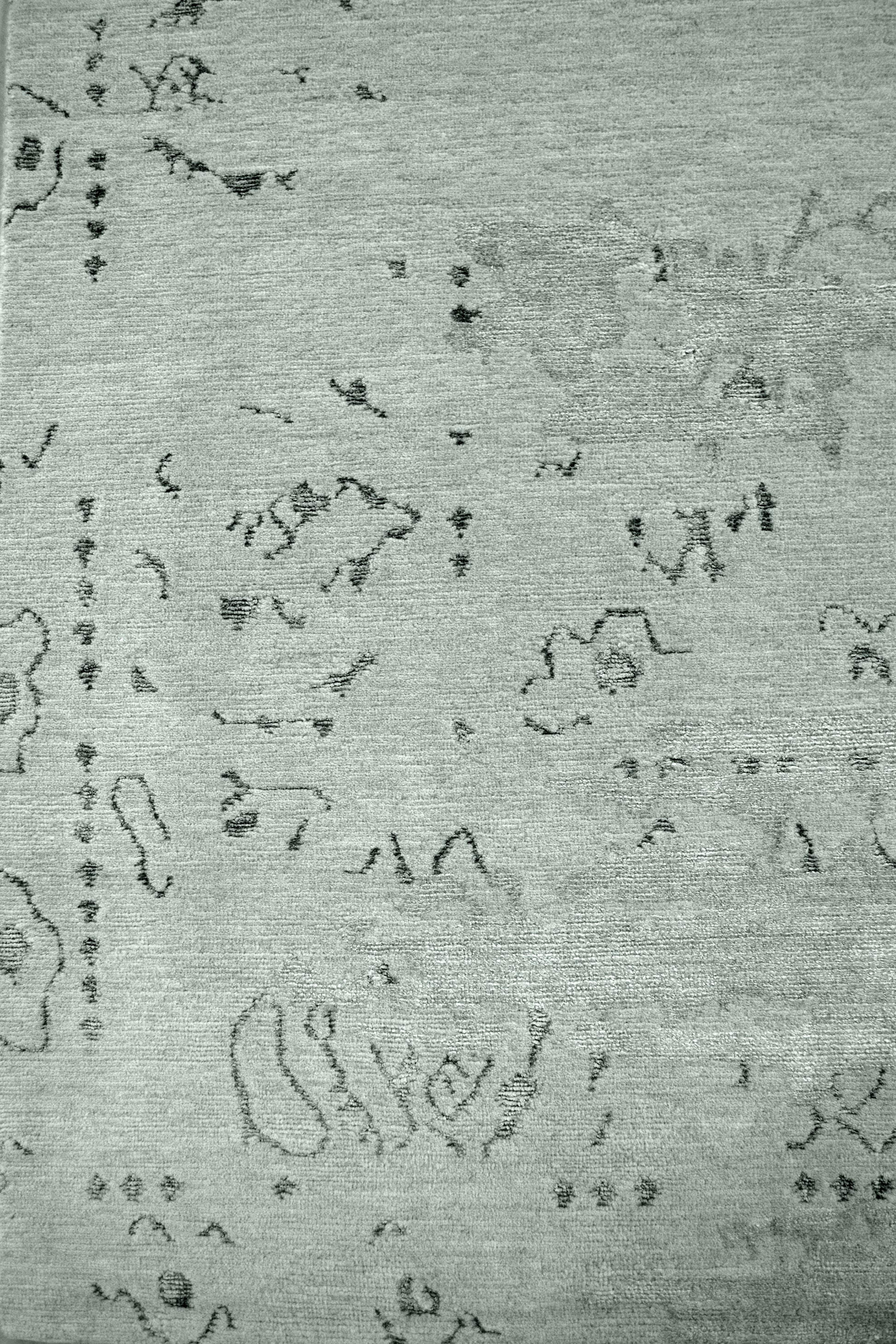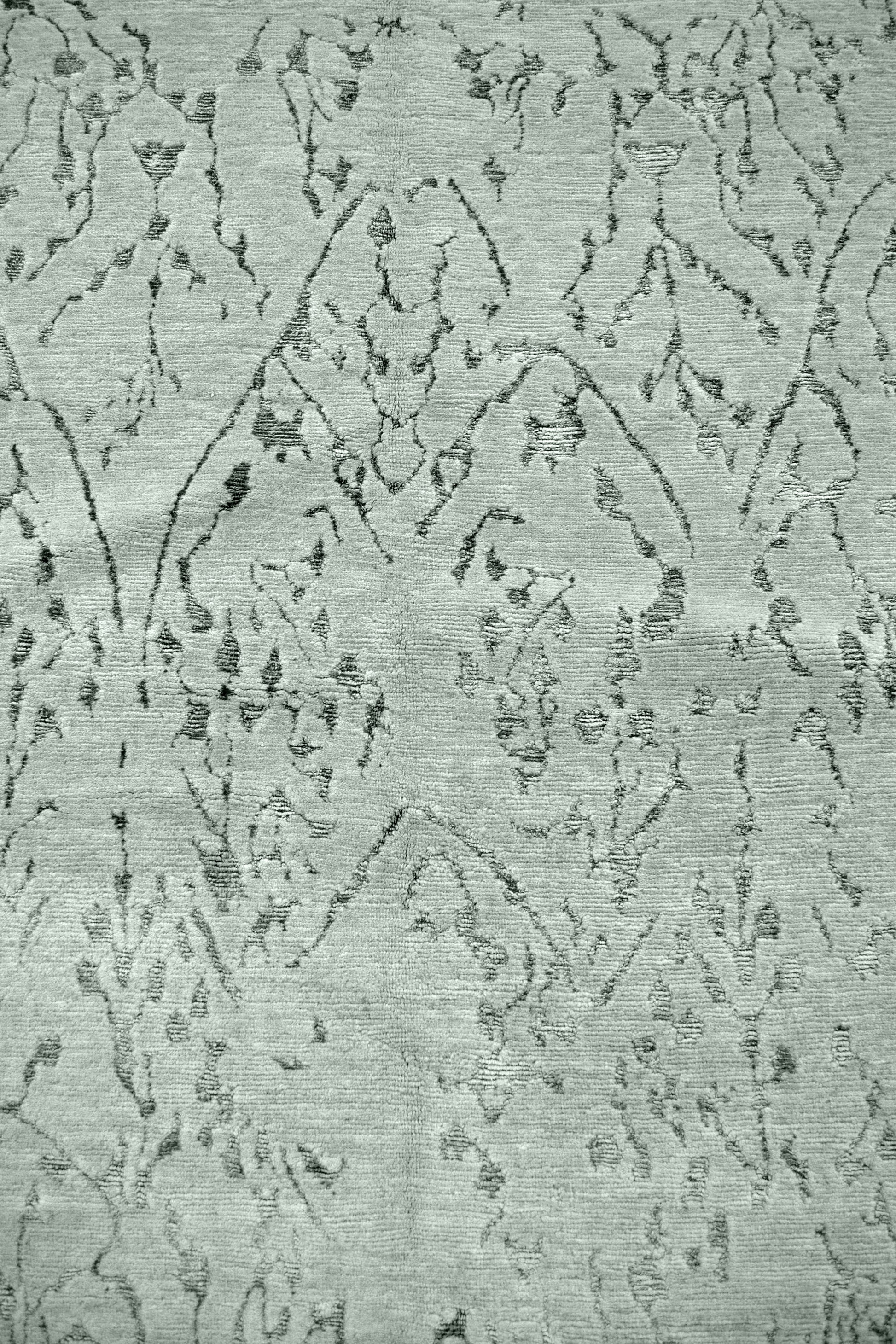 Plaisir! Classic rug comes from our precious French collection. The pattern is simple, the color scheme is white, and silver for this carpet. White classic rug has a big ornament pattern in gray. On the bottom left corner, there is a dotted border. On the top right corner, the white background shows random mini gray branches. The center's close-up shows mini gray branches.