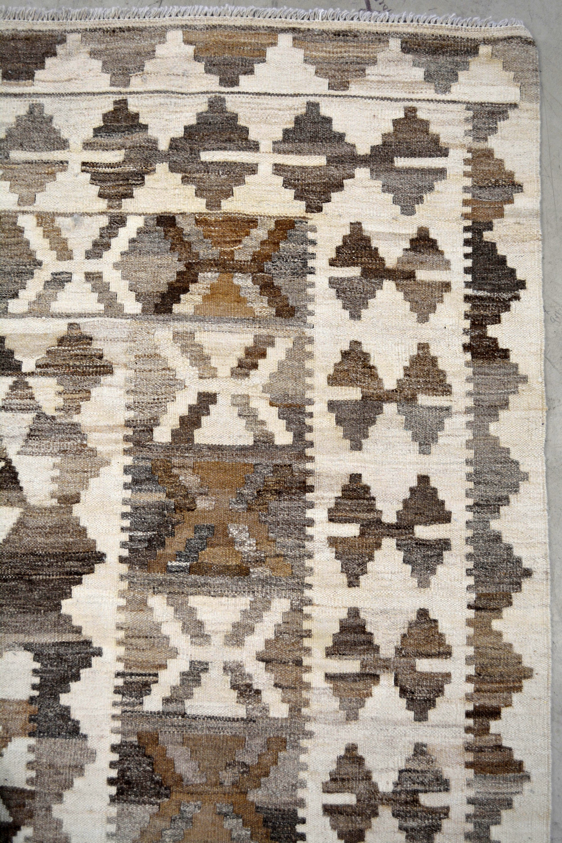 This carpet comes with beige background and a greco roman pattern in gray and brown. On the bottom left corner, there are pyramids, and rhombuses. Also, the thicker frame renders sand clock timers. The center's close-up displays rhombuses made by waves representation.