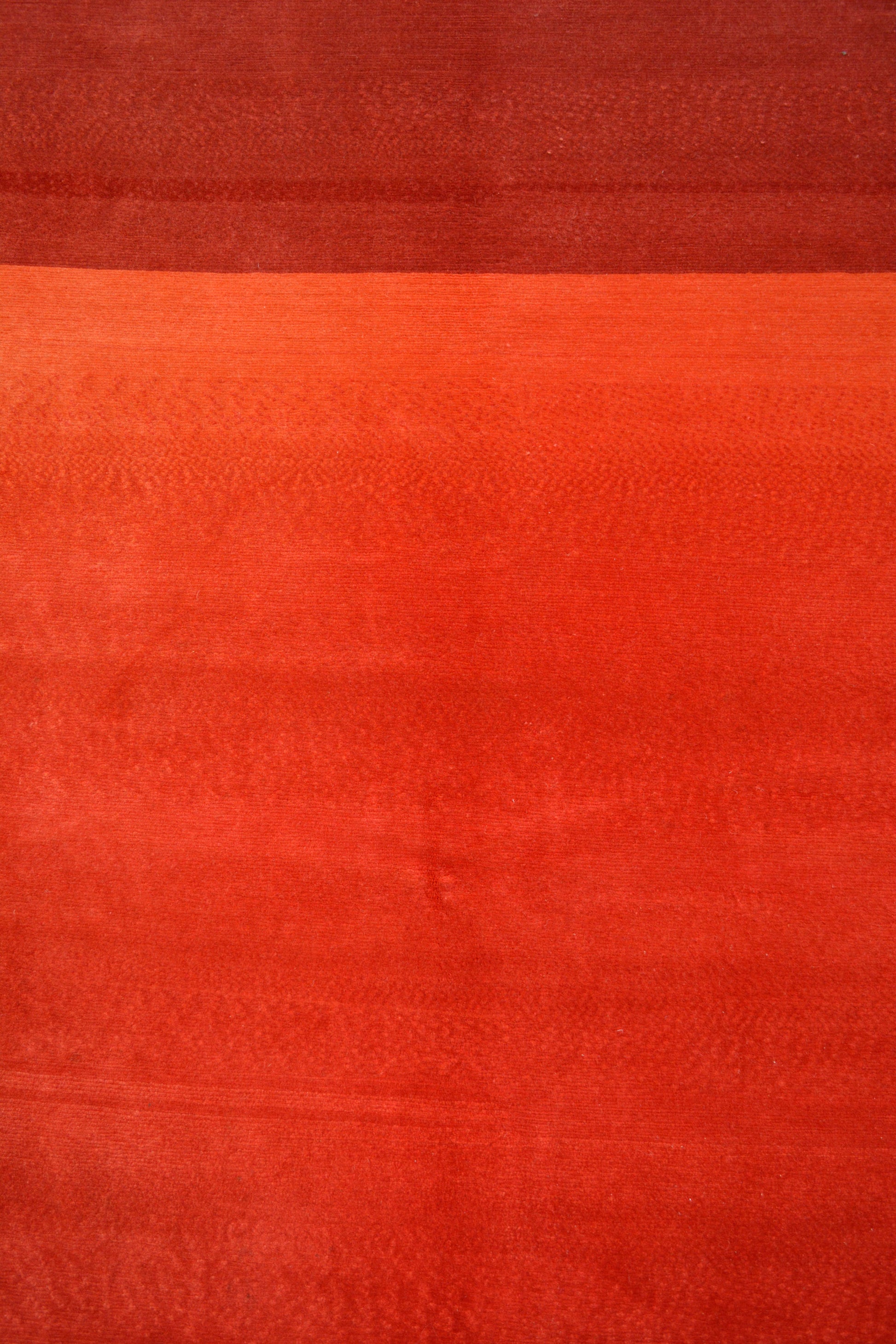Exciting rug was woven from the heart of Nepal, and it is full of power, confidence, and love. This energetic carpet comes in red, and the design renders two gradients. The outside gradient goes from bottom dark red to top bright red. The inner rectangle is another gradient which goes from top dark red towards light red at the bottom. The center's close-up renders red variations.